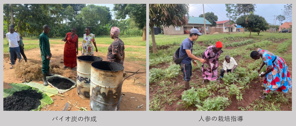 コメ栽培の普及活動をきっかけに、村の農業の実態についてよりよく知り、また農家に知り合いの農家を紹介してもらうことも増えたため、稲作の活動と並行して新たな活動を模索するようになりました。そこで、農協のマネージャーと話し合って、農協前のスペースで野菜を育てること、動画トレーニングを農家向けに行うことにしました。農協前のスペースを選んだのは、農家がトウモロコシの製粉やワークショップ参加などで定期的に農協に訪れるので、実際の様子を自分の目で見て学んでもらうのに、ぴったりの場所だと思ったからです。そこでは、バイオ炭を利用した野菜の栽培に取り組みました。バイオ炭が炭にならずに燃えて灰になってしまったり、ヤギに野菜を食べられてしまったりと、うまくいかなかったこともありましたが、なんとか播種から収穫まで行うことができ、この野菜圃場は、デモ圃場としての役割を示すことができました。中でも人参は、ウガンダで人気な野菜ですが、任地周辺では栽培が行われていなかったため、農家の関心を引き、最終的に5人の農家が自身の圃場で人参栽培を始めました。また、自発的に他の農家へ栽培を教えてくれる農家も現れたため、農家同士の知識の普及を見ることができました。このような普及の流れは農家の自発性に基づく理想的なものであり、知識の普及だけでなく、農家同士の結びつき、繋がりも生むことができることを学びました。動画トレーニングは、知り合った他のNGOの方から農業に関わる動画にアクセスできる情報を教えていただき、それを活用しました。英語だけでなく、現地語に翻訳されたものにもアクセスできるので、現地語での会話がメインの任地の農家にはぴったりな教材でした。自分は動画を通じて知識を共有する立場でしたが、情報と農家を繋いで彼らの理解、自発的な行動を促すことができたように感じています。