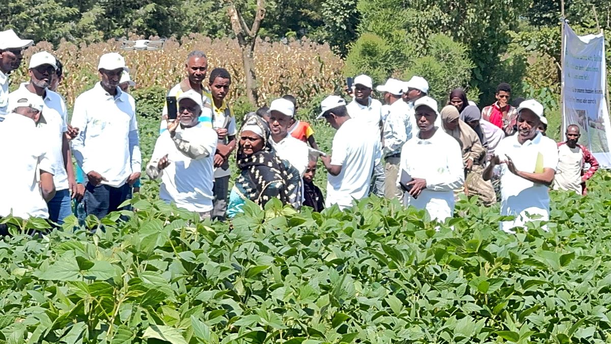 Ms. Meryema introduces her soybean farm to participants at a regional field dayHigher Yields and Improved Livelihoods